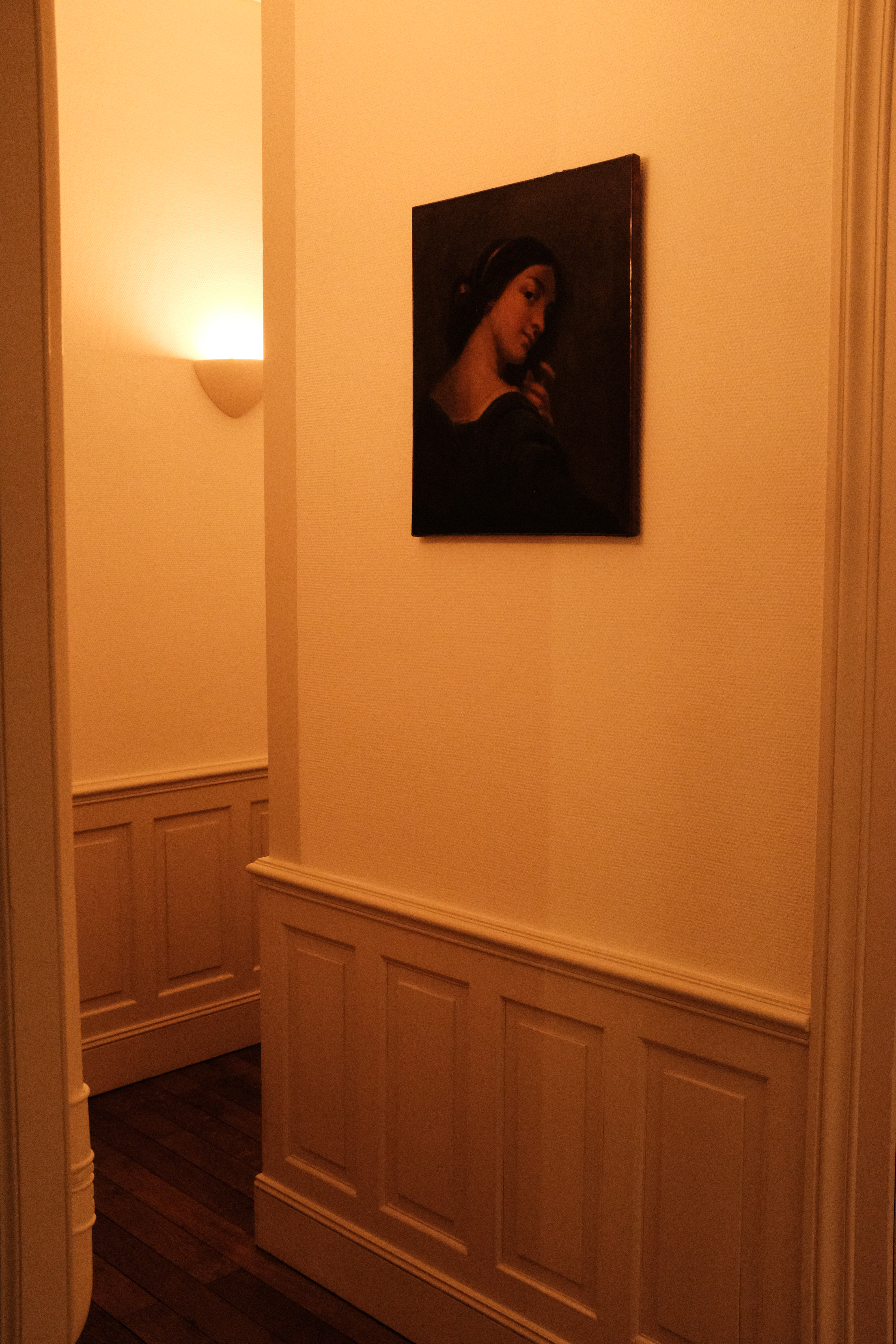Un tableau de peinture du 19ème siècle qui me rappelle le style du peintre Vilhelm Hammershøi. Il représente une femme de dos, en robe bleue, posant un vase sur le rebord de la cheminée.