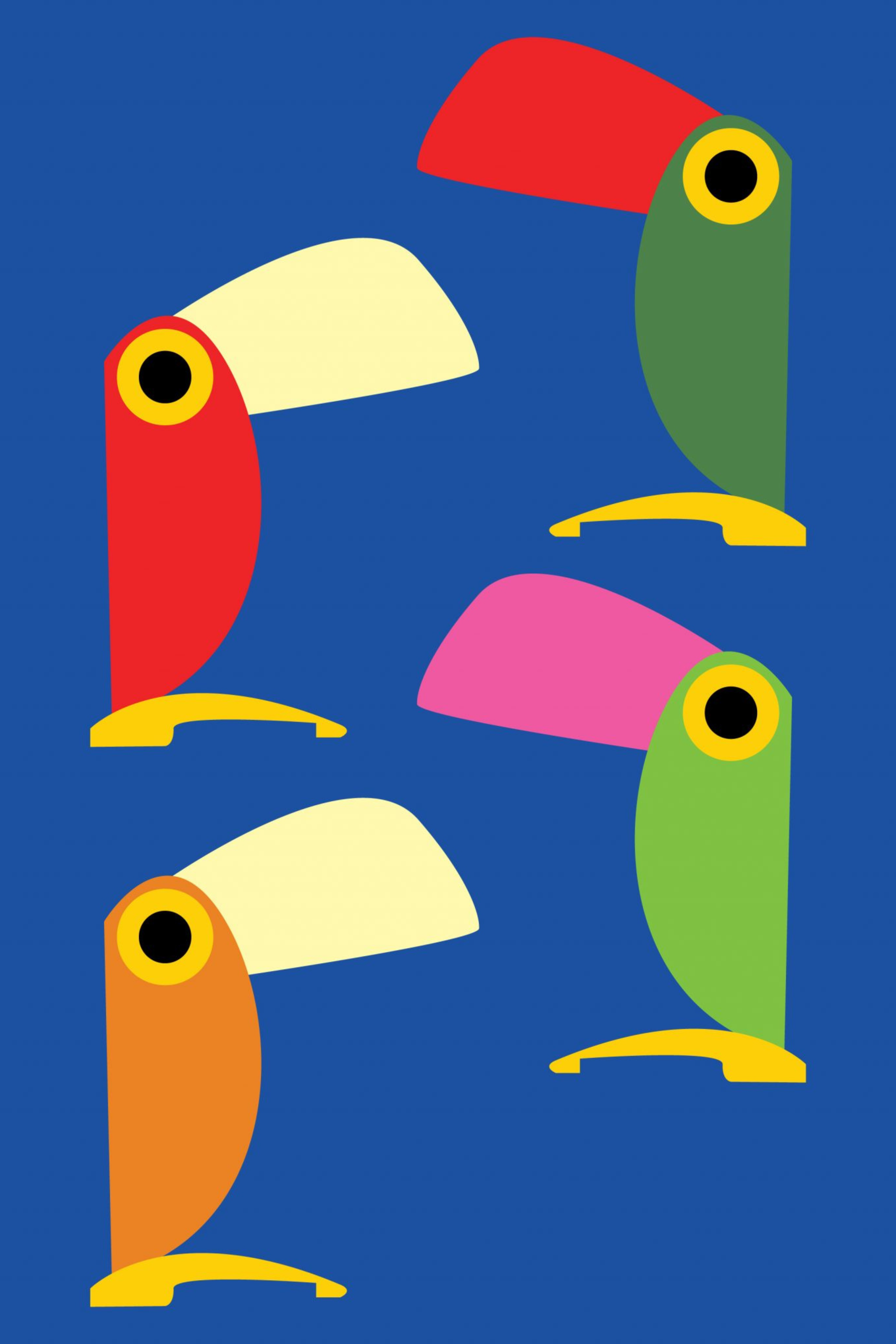Il existe par ailleurs plusieurs exemples qui, à des fins purement commerciales, ne portent aucune marque. Certains grands importateurs étrangers ont en effet demandé et obtenu cette petite variation. En tout cas, ces modifications n’altèrent pas son originalité , l’important est que la forme du corps, du bec et du pied soit identique et que la lampe ait été produite en Italie. En fait, il n’existe ni versions authentiques produites dans d’autres pays, ni versions authentiques de formes ou de tailles différentes. Toutefois, les couleurs des différentes pièces qui composent le Toucan peuvent varier.