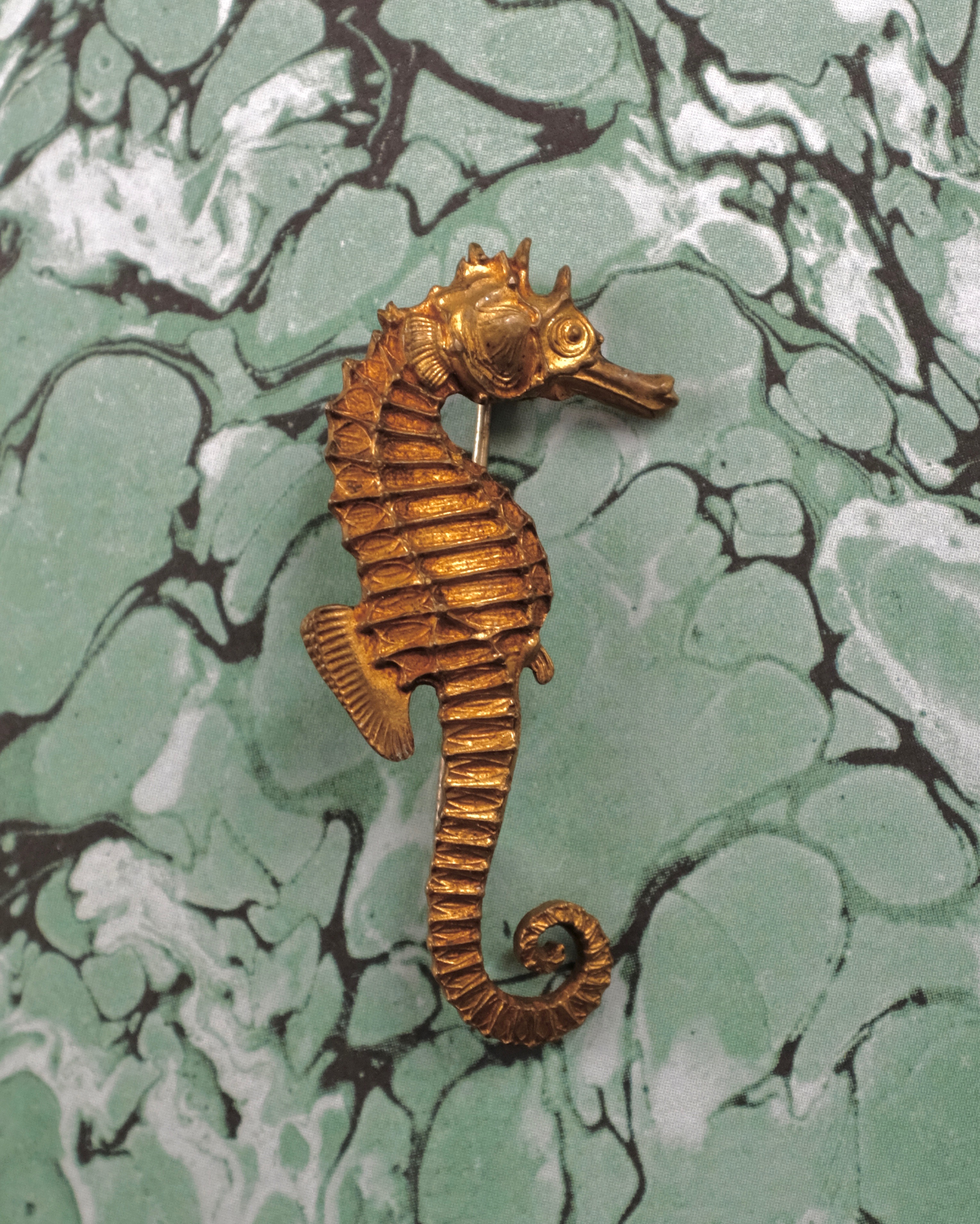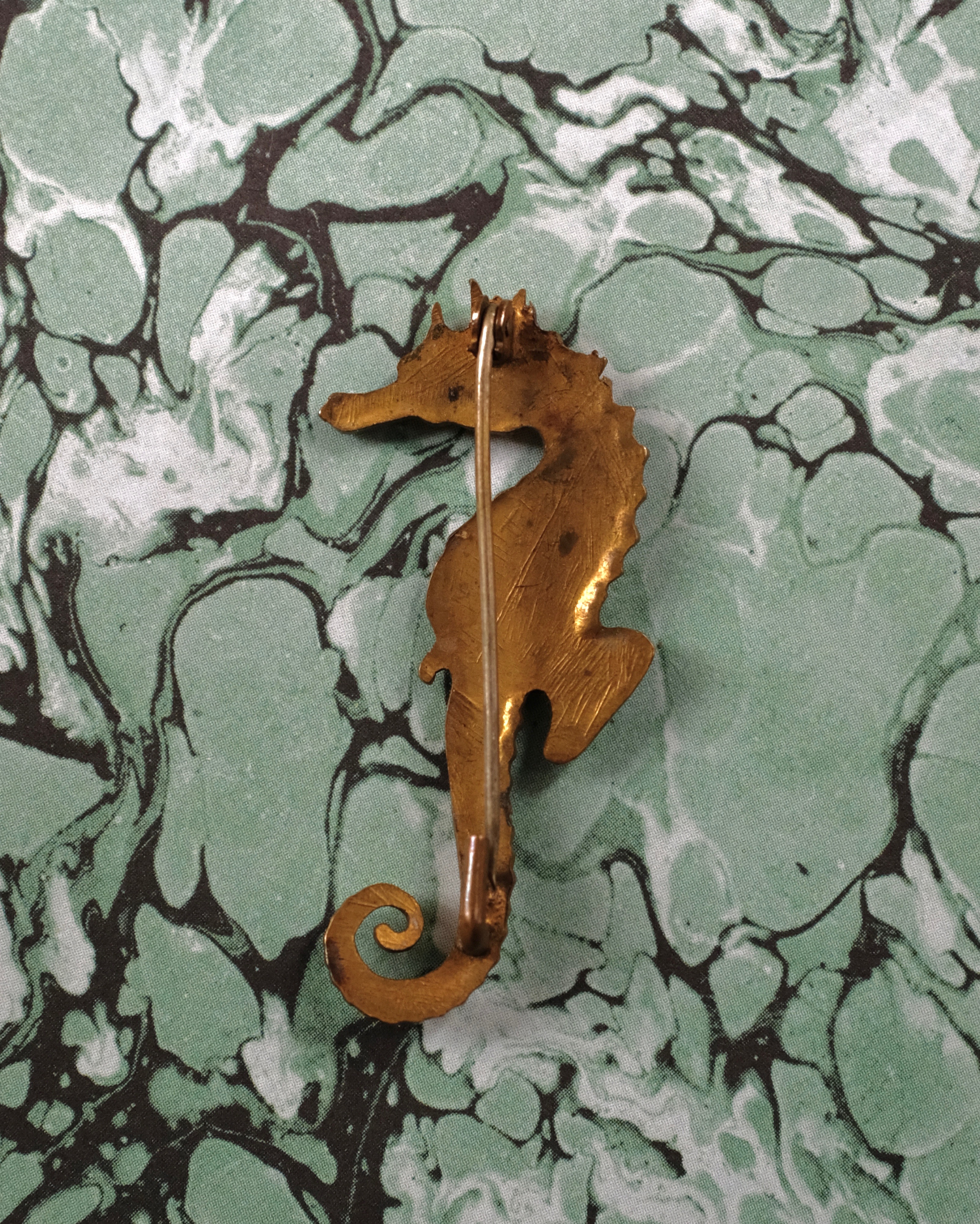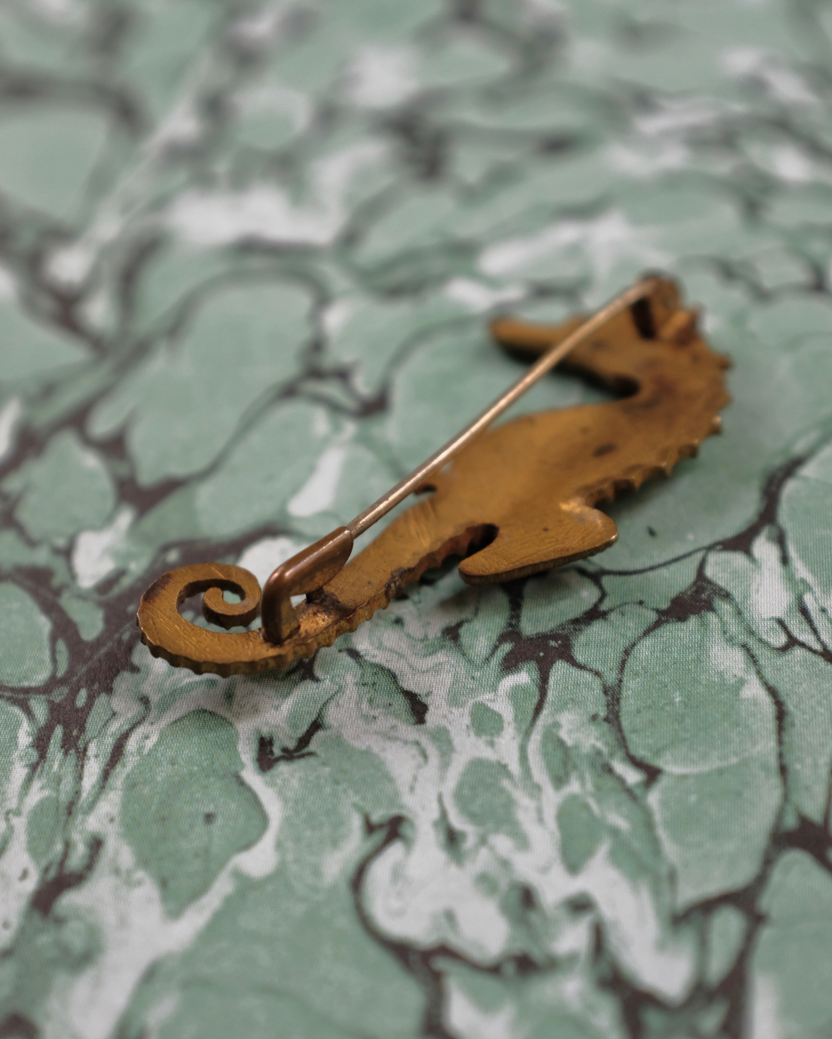 Magnifique broche ancienne en forme d’hippocampe, en alliage doré, avec attache de sécurité. À porter sur une veste de tailleur, un t-shirt, un sac… ou encore à exposer comme objet de décoration. Pièce rare des années 50.