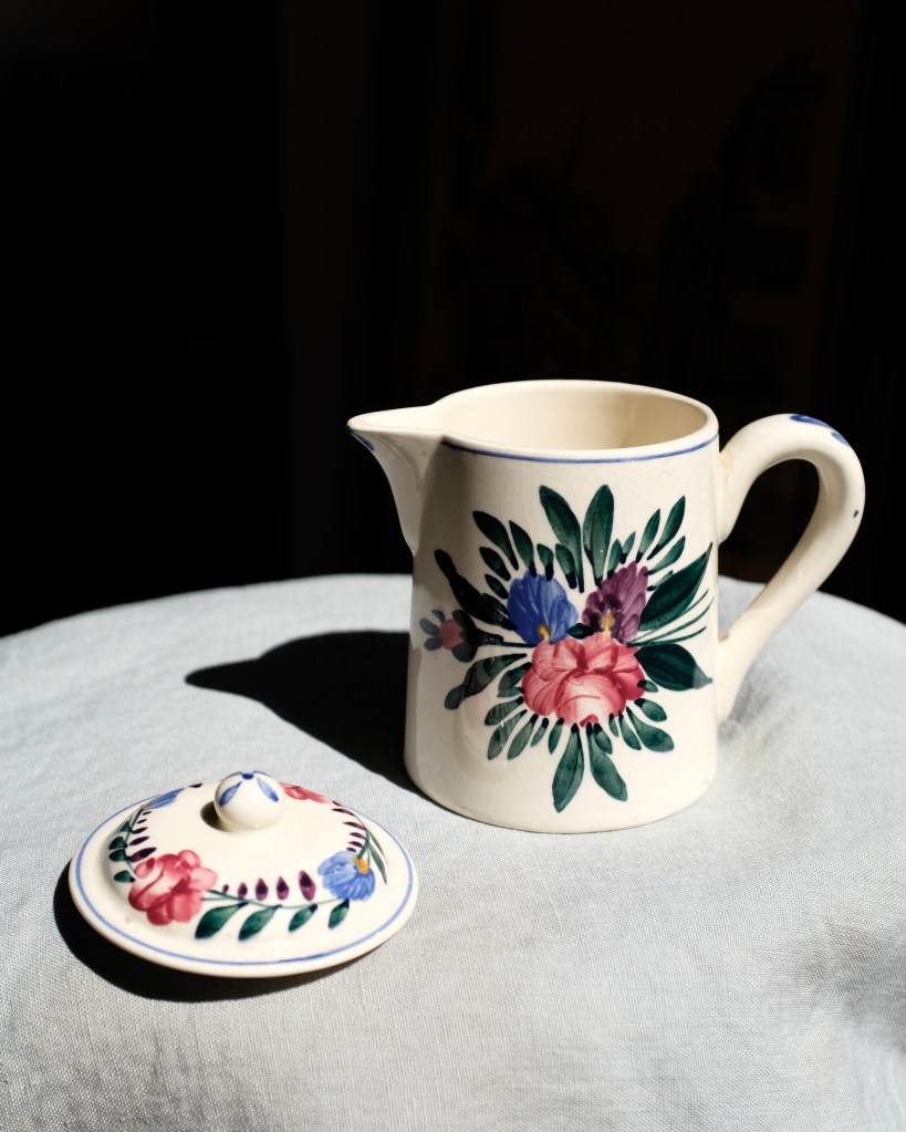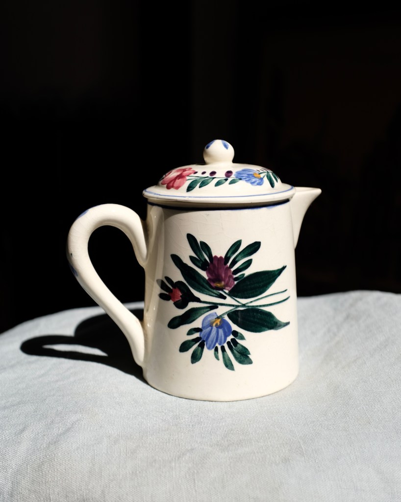 Petite cafetière en faïence de Sarreguemines – décor « Forêt des Vosges » peint à la main – années 1920. Modèle rare.