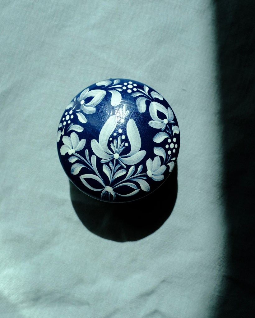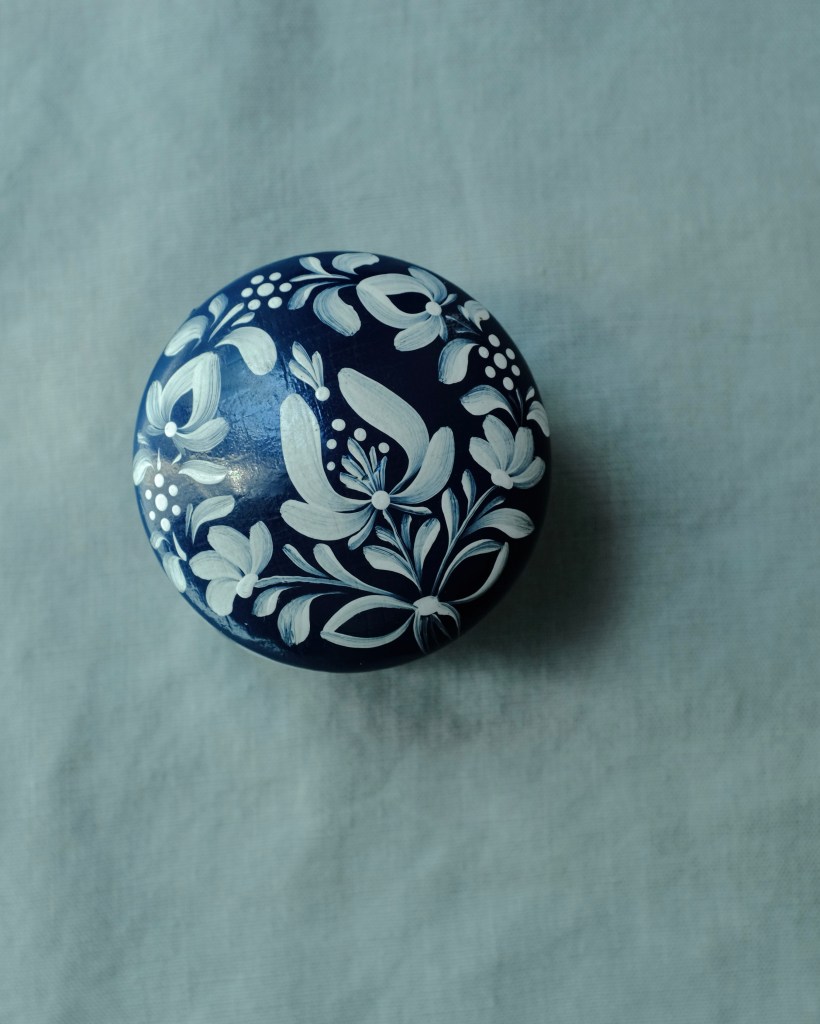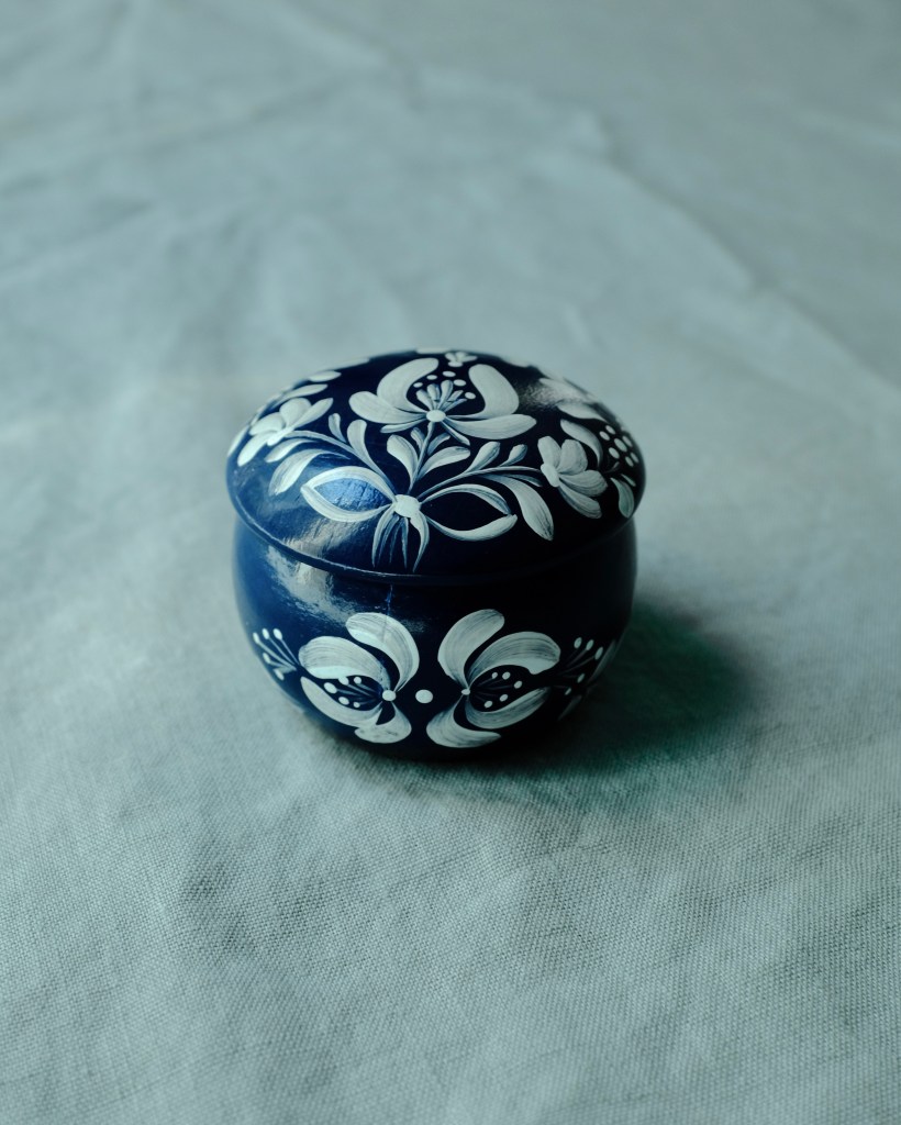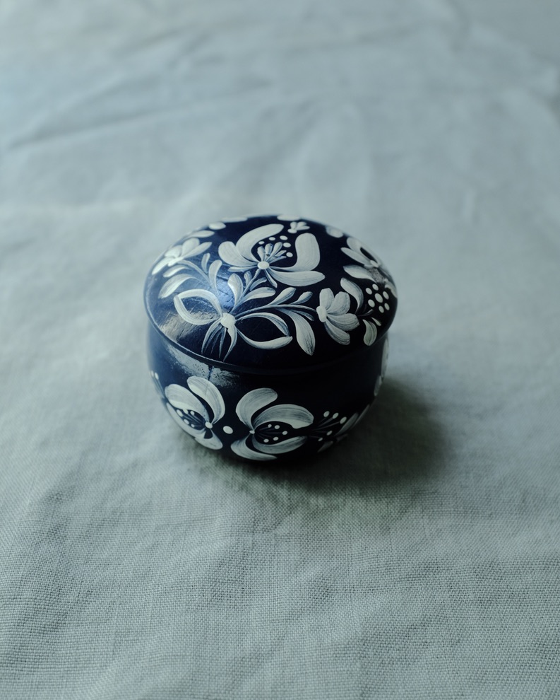 Petite boîte ronde avec couvercle, en bois peint dans un bleu profond. Elle est décorée à la main de motifs floraux blancs stylisés, répartis harmonieusement sur le couvercle et les côtés. Le style évoque les arts populaires d’Europe centrale ou de Scandinavie, avec une touche artisanale et poétique.