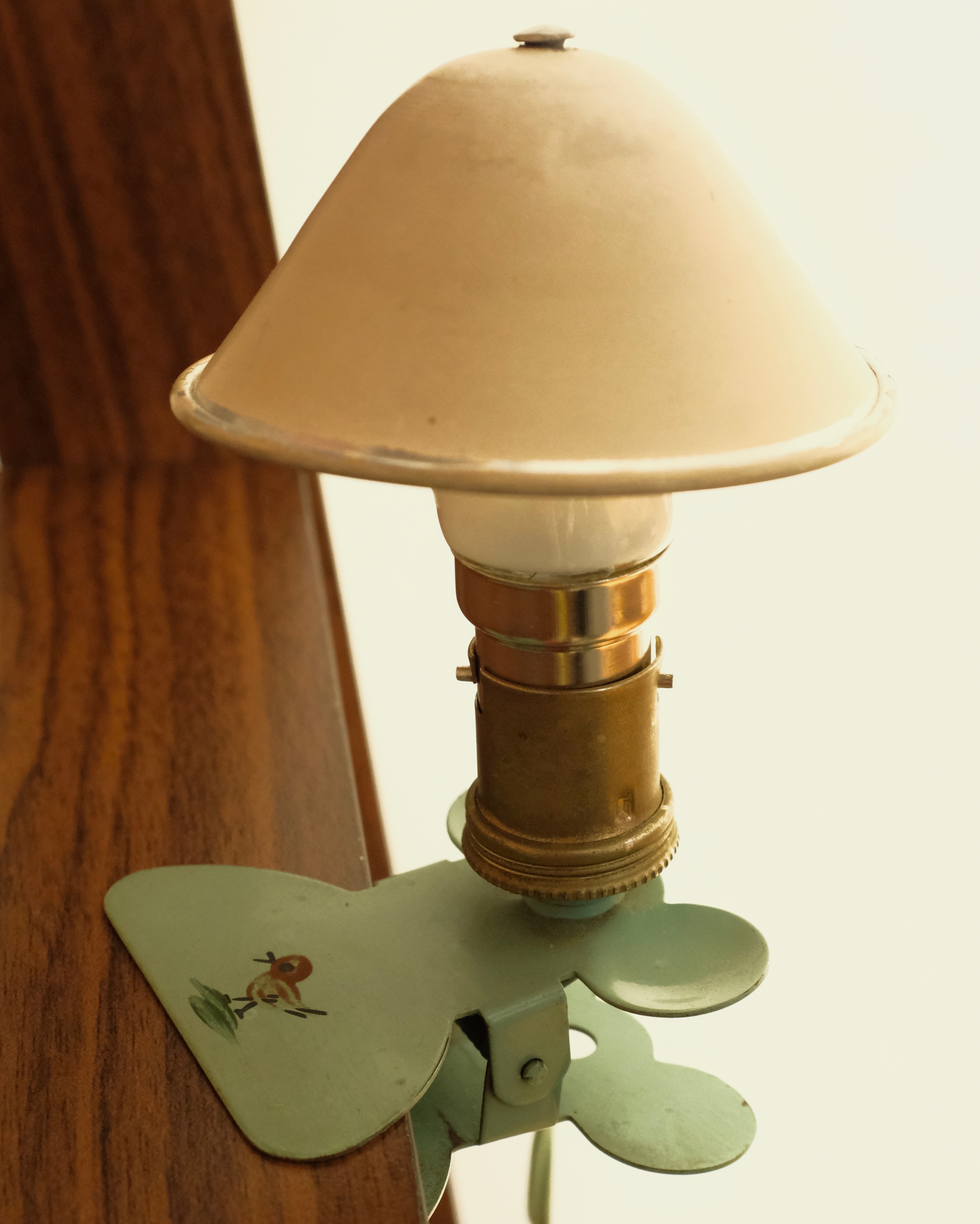 Jolie lampe baladeuse, avec son chapeau en forme de champignon et sa pince illustrée d’un petit oiseau. Parfaite pour un éclairage d’appoint dans une chambre d’enfant ! Cette lampe liseuse / veilleuse date des années 60.