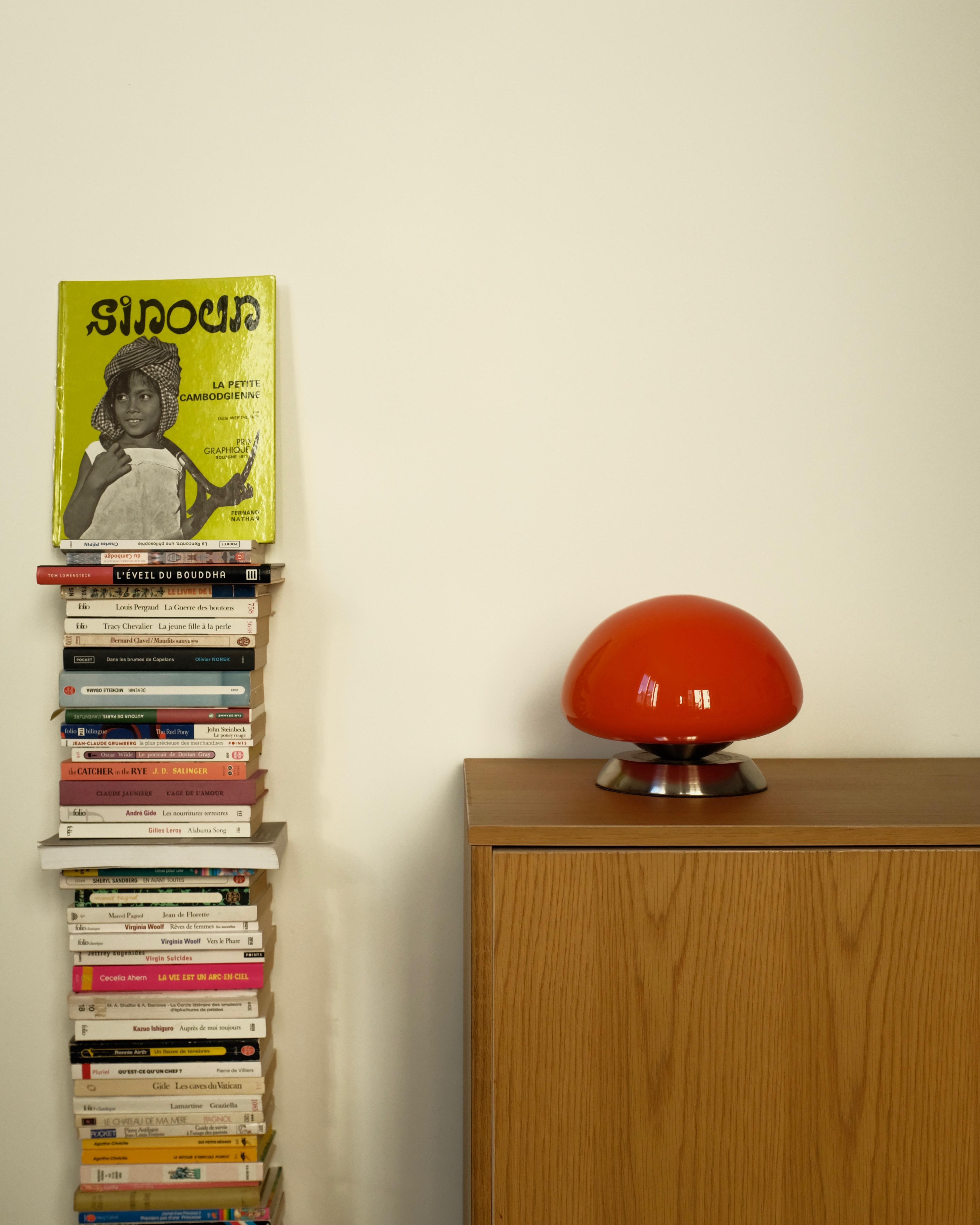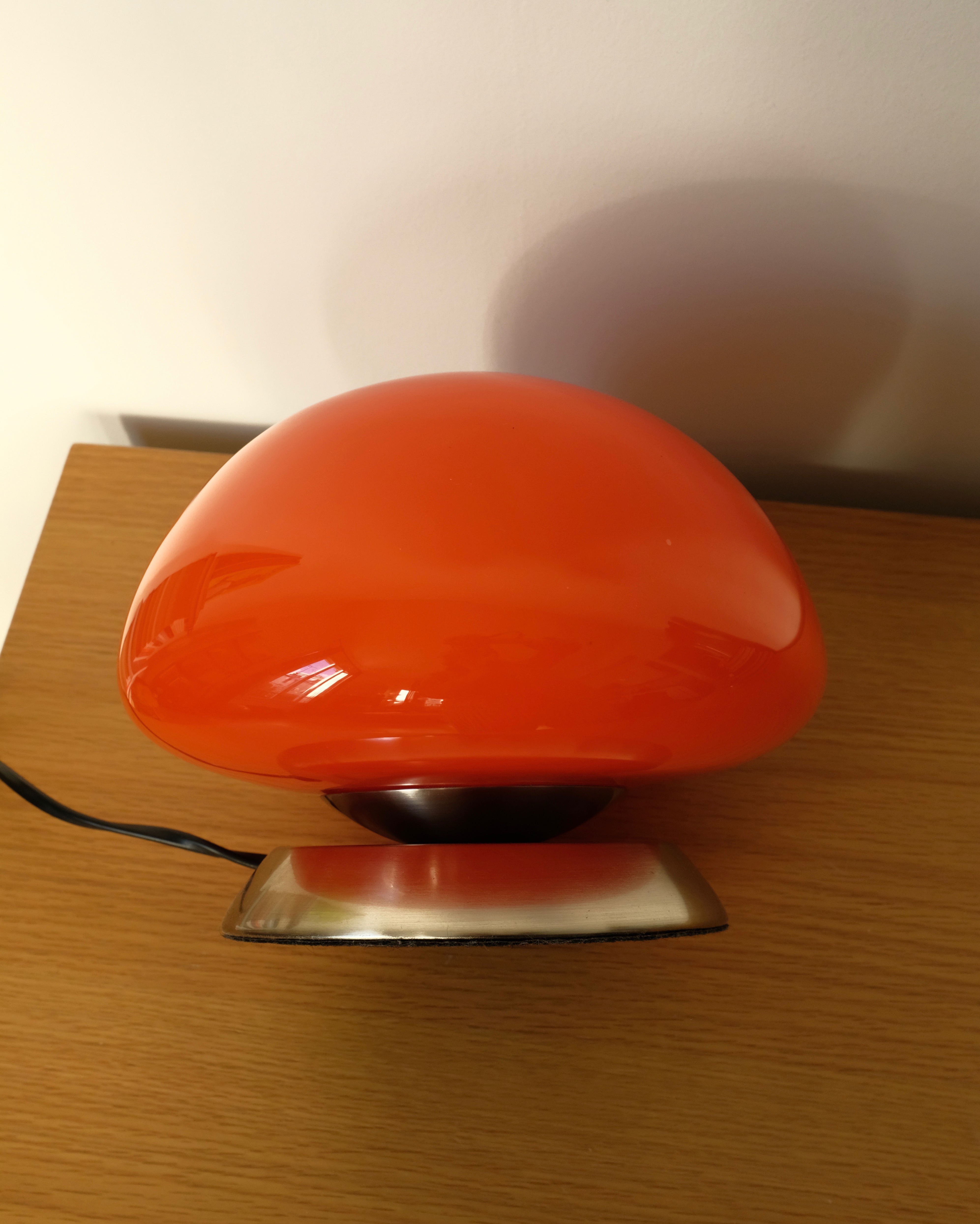 Superbe lampe de table en forme d’ovni, style années 60-70 (design Space Age). Tactile, elle éclaire d’une simple pression sur le socle en inox (le socle est de ce fait sensible à la moindre pression). Son globe est en opaline orange et crée ainsi une jolie ambiance orange / intimiste.