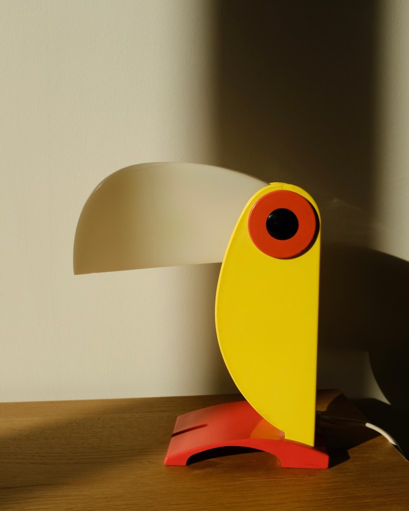 En 1964, Enea Ferrari, alors jeune designer véronais, fonde Old Timer Ferrari, une entreprise spécialisée dans la production d’objets, d’accessoires et de luminaires. Le lancement de la lampe Tucano a eu lieu en 1970 : c’était la première lampe pour enfants conçue en plastique ! Le design coloré et figuratif prédit le mouvement Memphis italien des années 80.