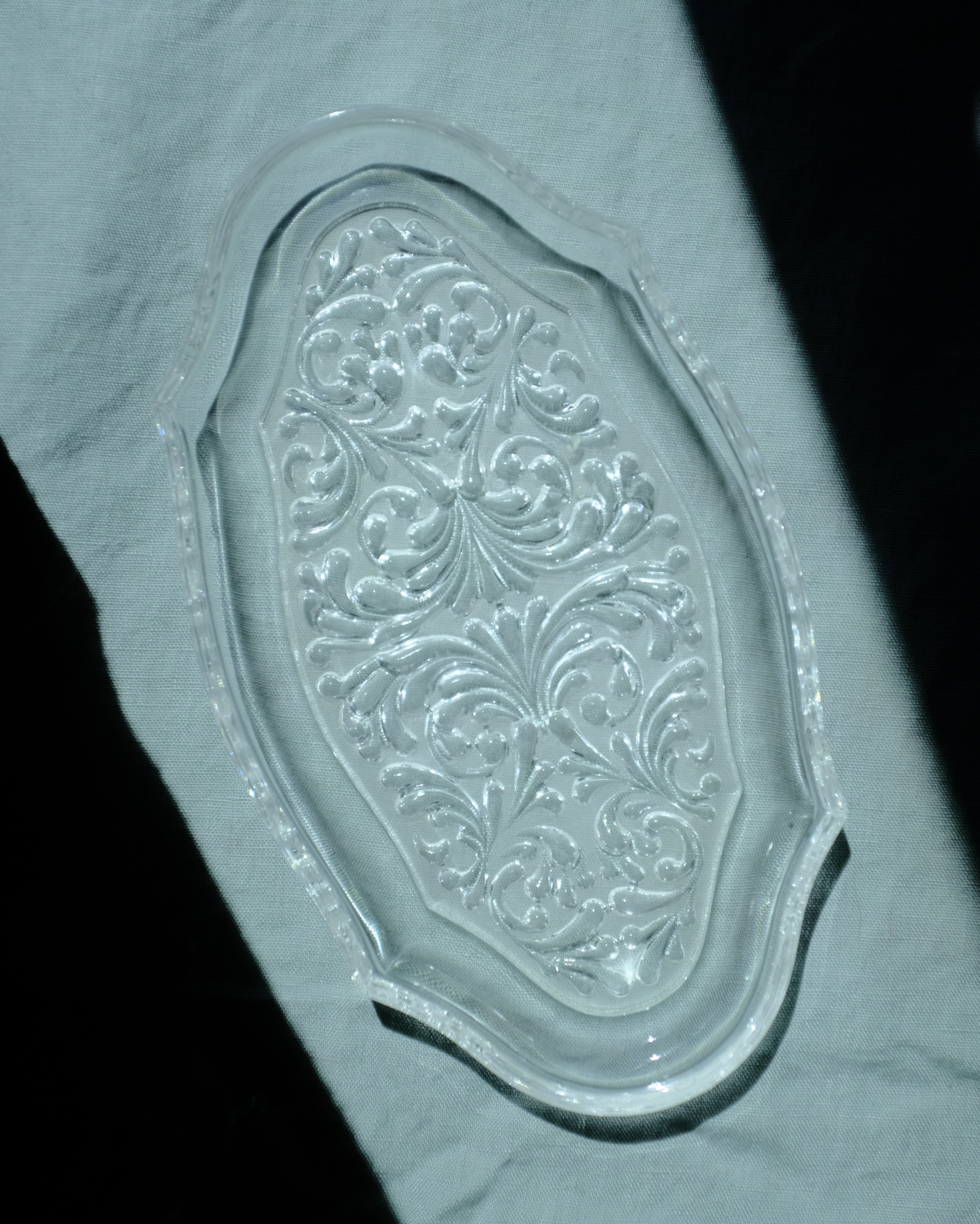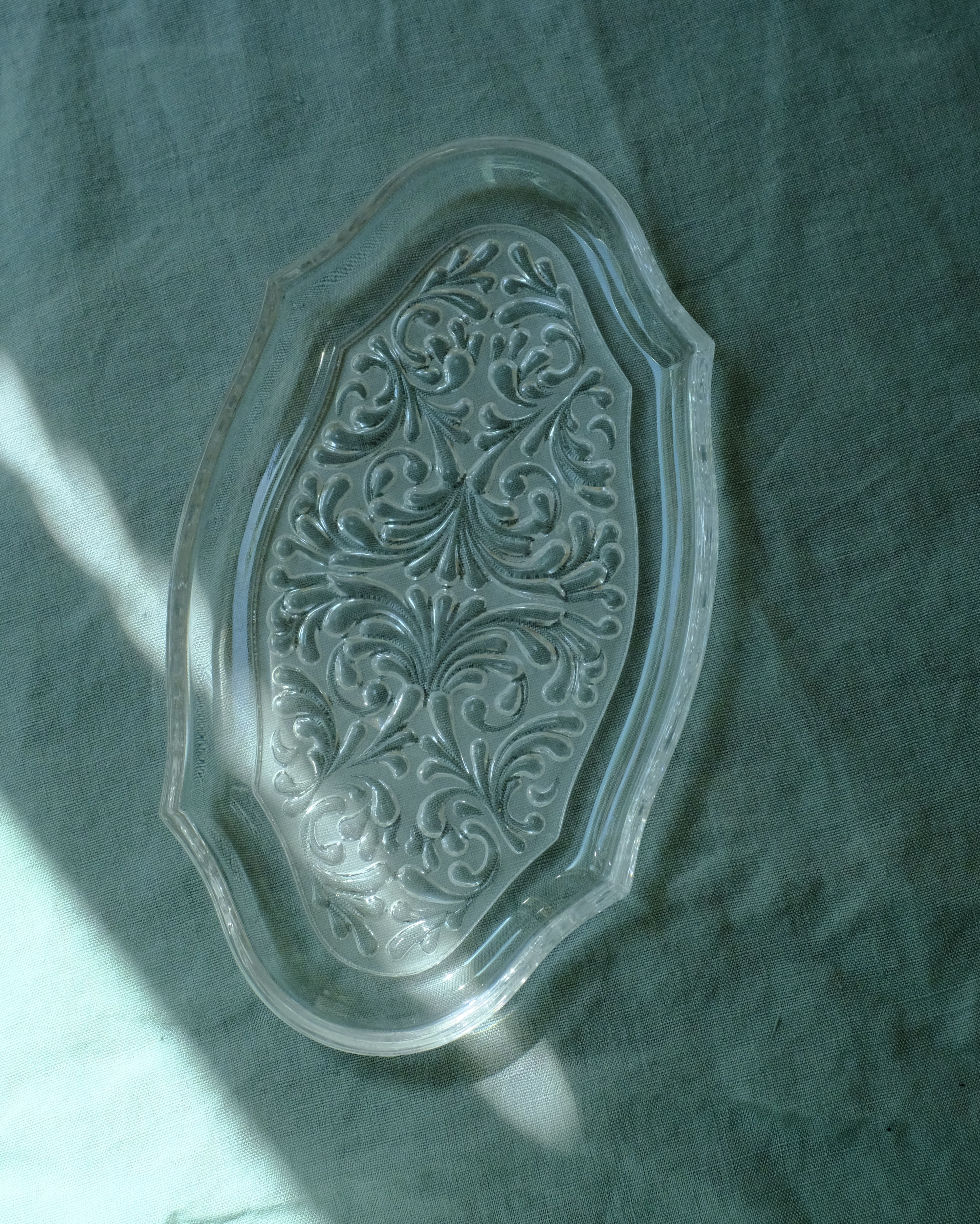 Les plats à cake en verre décoré apparaissent à la fin du XIXe siècle, dans un contexte d’essor industriel et d’engouement pour les arts de la table. Grâce aux techniques de moulage du verre pressé, il devient possible de produire en série des objets autrefois réservés à une élite, tout en conservant un fort pouvoir ornemental. Inspirés des styles baroque, rococo ou Art nouveau, ces plats présentent des motifs en relief — volutes, palmettes, feuillages — qui imitent les riches décors du cristal taillé à moindre coût.