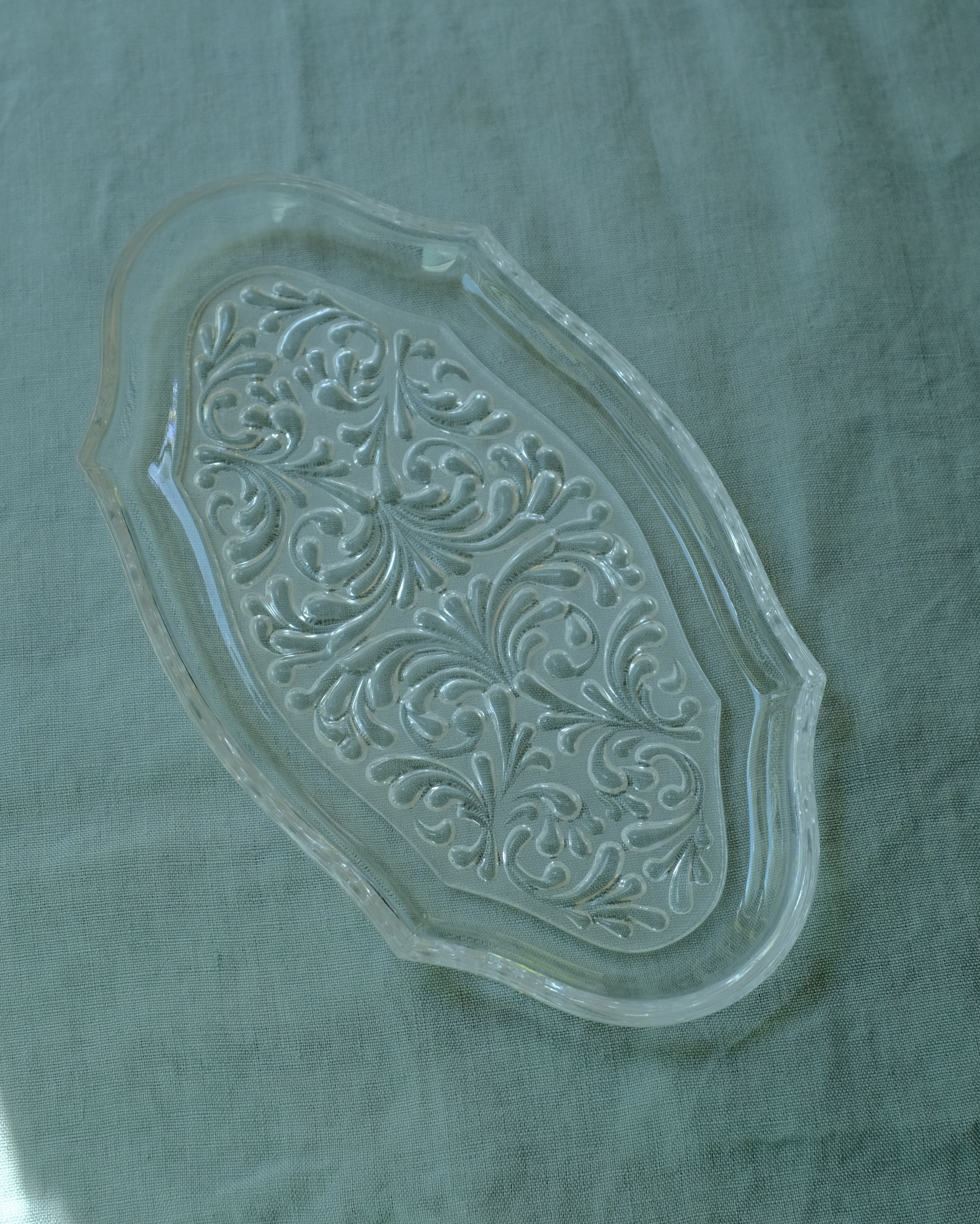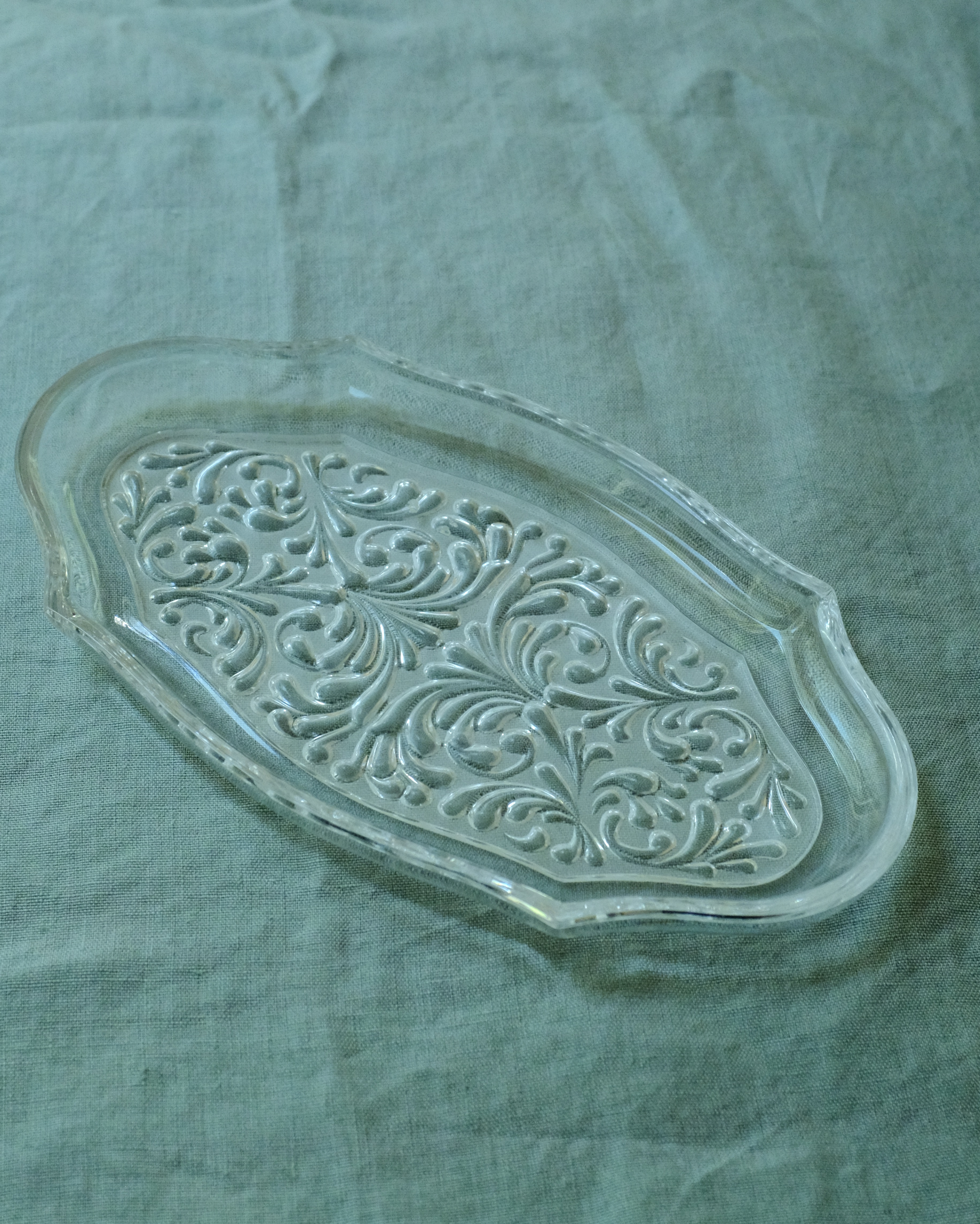Plat à cake en verre cristal au design baroque, orné de délicates arabesques finement moulées en relief, évoquant des feuilles d’acanthe ou des palmettes. Son contour ondulé et son motif symétrique apportent une touche élégante et vintage à votre table.