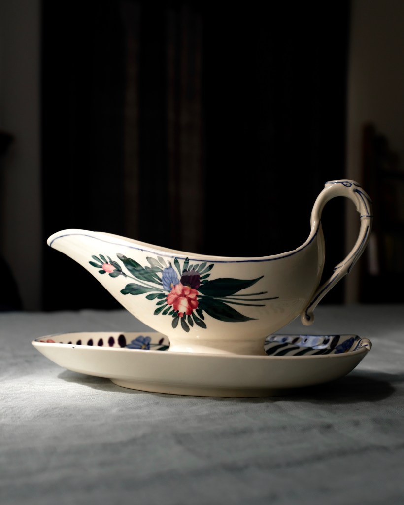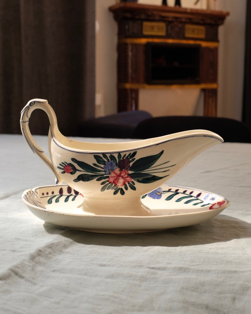 Saucière en faïence de Sarreguemines – décor « Forêt des Vosges » peint à la main – années 1920.