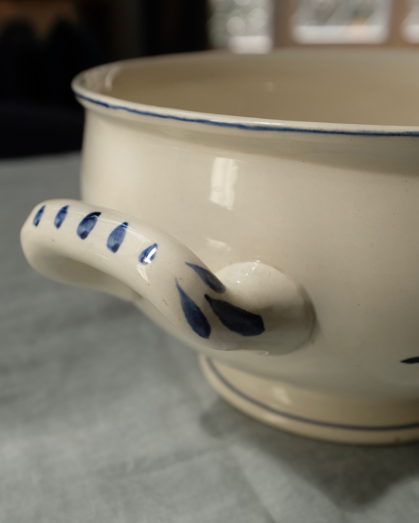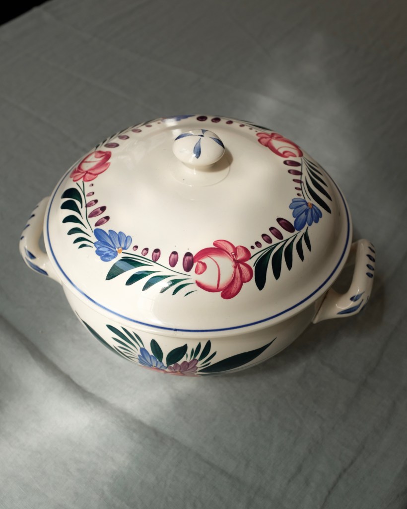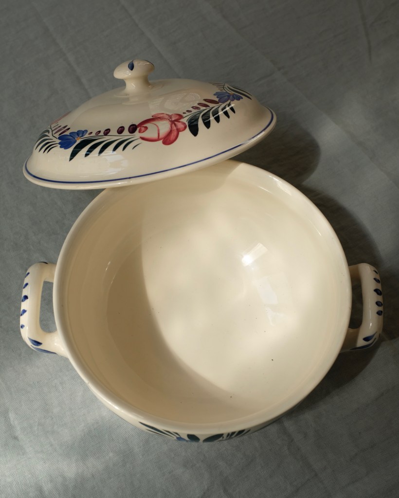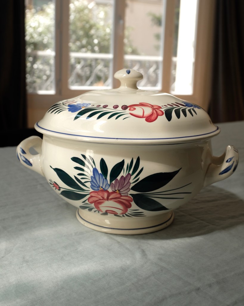 Soupière en faïence de Sarreguemines – décor « Forêt des Vosges » peint à la main – années 1920. Modèle rare.