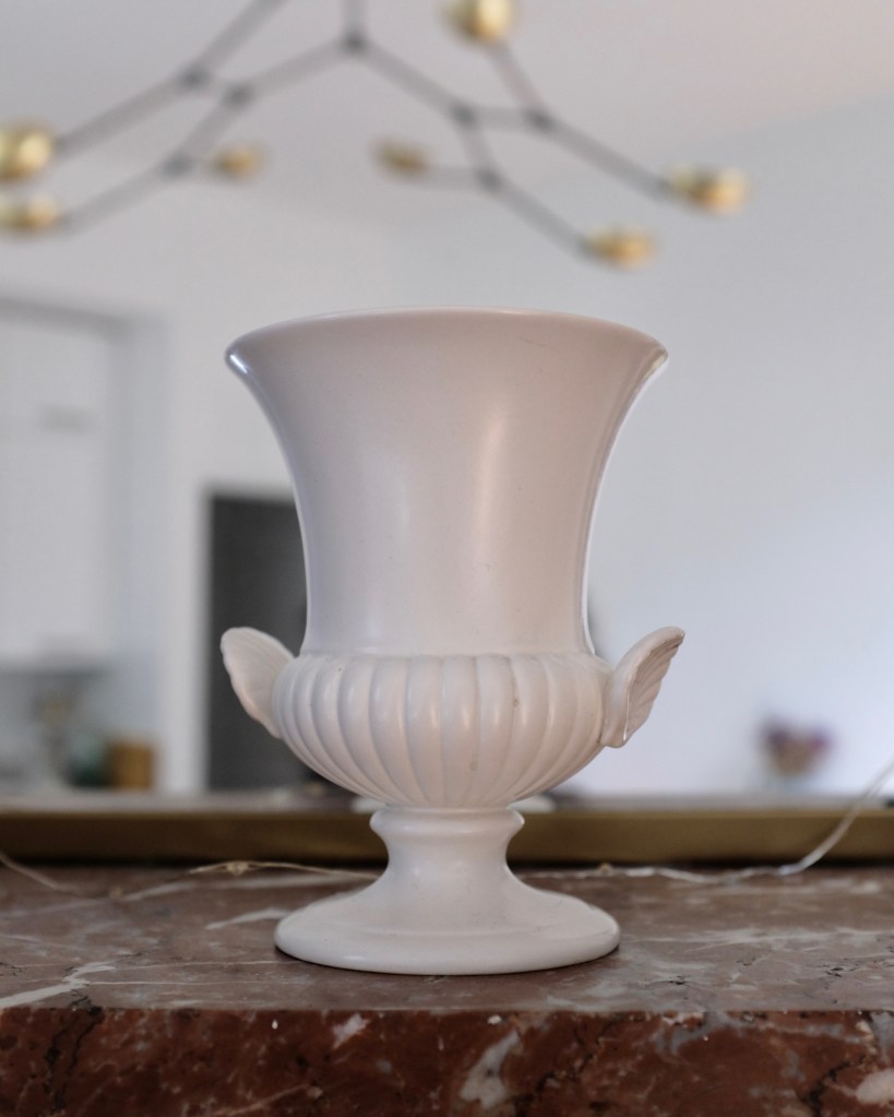 Petit vase / urne estampillé Wedgwood avec deux poignées en coquille Saint-Jacques. Introduite en 1933 par Norman Wilson, la glaçure « moonstone » a été largement utilisée sur les conceptions de Wedgwood. Ressemblant au marbre, l’émail a un éclat très doux par opposition à un aspect purement mat.